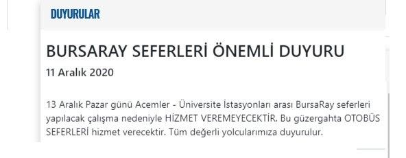 Ayrıca ikinci uyarıda ise , "13 Aralık Pazar günü Acemler - Üniversite İstasyonları arası BursaRay seferleri yapılacak çalışma nedeniyle HİZMET VEREMEYECEKTİR. Bu güzergahta OTOBÜS SEFERLERİ hizmet verecektir. Tüm değerli yolcularımıza duyurulur" ifadeleri kullanıldı.