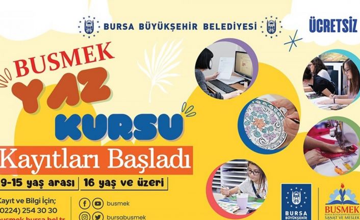 Bursa Büyükşehir Belediyesi Sosyal Hizmetler Dairesi Başkanlığı Hayat Boyu Öğrenme Şube Müdürlüğü’ne bağlı BUSMEK, ücretsiz kurslarıyla geleneksel sanatları öğretip sevdirmeye, meslek eğitimleri ile de meslek sahibi olamayan Bursalılara imkân tanımaya hız kesmeden devam ediyor. 16 yıldır bilişim teknolojileri, el sanatları, güzellik ve bakım hizmetleri, giyim üretim, muhasebe finansman, kişisel gelişim, spor ve yabancı dil gibi alanlarda yüzlerce branşta ücretsiz kurslarla Bursalıların yanında olan BUSMEK, çocukların da eğitimlerden yararlanması adına yaz kursları düzenliyor. Yaz kurslarında, 9-15 yaş çocuk ve 16 yaş üzeri yetişkin kursiyerlere eğitimler veriliyor. Kurslara busmek.bursa.bel.tr internet adresinden online ön kayıt olunabileceği gibi aynı zamanda BUSMEK kurs merkezlerinden de kayıt yaptırılabilecek. Başvurular, 30 Haziran’a kadar devam edecek ve dersler ağustos ayında başlayacak.