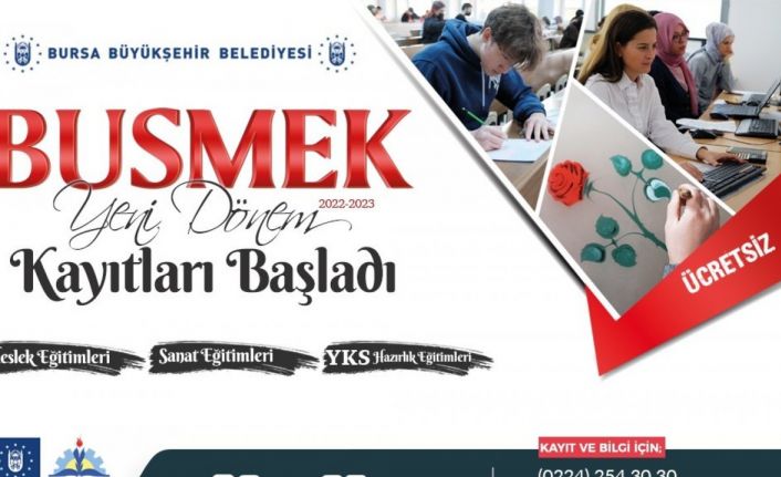 BUSMEK, 2022-2023 eğitim döneminde 350 farklı branş ile nitelikli eğitimlere hız kesmeden devam ediyor. Kurslara busmek.bursa.bel.tr adresli internet sitesinden online ön kayıt yapılabileceği gibi aynı zamanda kurs merkezlerinden de işlem tamamlanabilecek. Ön kayıt için kursiyerlerin ‘TC kimlik numaralarını girerek’ ilgili tüm seçenekleri hatasız ve doğru şekilde doldurması gerekiyor. Bilgileri hatalı olan kursiyerlerin kayıtları geçersiz sayılacak. Ayrıca, Merinos Yönetim Merkezi’nden veya 254 30 30 numaralı telefon ile eğitimler ve başvurular hakkında bilgi alınabilecek. Kontenjanı dolan bazı branşlarda (Kurs bitiş tarihine göre) yeni gruplar açılacak. Yeni kayıtlardan haberdar olmak için duyuruların takip edilmesi gerekiyor.