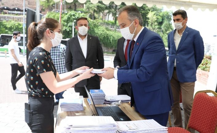 Bursa Büyükşehir Belediye Başkanı Alinur Aktaş da Zafer Plaza önüne kurulan standı ziyaret ederek, bizzat kaydını yaptığı üniversite adaylarına test kitaplarını ve sınav setlerini hediye etti. Günler sonra dışarıya çıkma mutluluğu yaşayan gençlerin heyecanına ortak olmak için böyle bir etkinlik yaptıklarını belirten Başkan Aktaş, “Biz gençlerimize gerçekten farklı imkanlar sunmaya çalışıyoruz. Gerek Milli Eğitim Müdürlüğü gerekse de Hocalara Geldik Başarı Merkezi işbirliğinde üniversite adaylarına yönelik hazırladığımız belirli organizasyonlar vardı. Ama korona virüsü salgını nedeniyle bunları bir miktar tadil etmek durumunda kaldık. Bugün de 10 bin adet Temel Yeterlilik Testi Türkiye Geneli Deneme Kitapçığı ile 10 bin adet kalem, silgi ve kalemtıraştan oluşan sınav setini hediye ediyoruz. Ayrıca 18 Mayıs günü de online bir deneme sınavı yapacağız. Bununla ilgili detaylı bilgilere isteyenler belediyemizim web sitesi ve sosyal medya hesaplarından ulaşabilirler. Yarınlarımızın mimarı Bursa’mızın ve ülkemizin geleceği olan gençler bizim için çok önemli. Biz onların geleceğine ışık tutmaya çalışıyoruz. Biz onların iyi bir mühendis, iyi bir öğretmen, iyi bir doktor, iyi bir mimar, avukat olarak yetişmelerinin yanında aynı zamanda devletine, milletine, geleneklerine bağlı ve beraberinde büyüklerine saygılı gençler olarak yetişmesini arzu ediyoruz. Biz gençlerimize yönelik gelecek planları yapmaktan asla geri durmayacağız” diye konuştu.