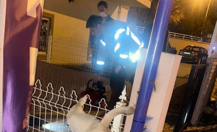 Bursa’da bir sitenin demir tellerine takılı kalan sokak köpeği, itfaiye ekipleri tarafından kurtarıldı.