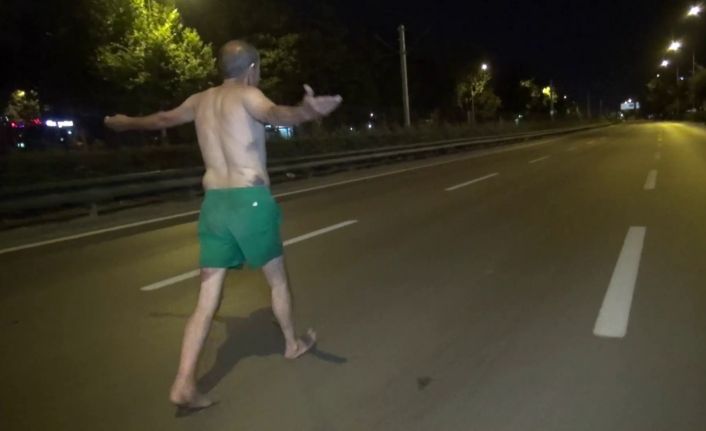 Olay gece saat 03.00 sıralarında merkez Osmangazi ilçesi Mudanya Caddesi üzerinde meydana geldi. Ana yolun üzerinde sadece altın şort olan R.O.’yu (54) görenler durumu polis ekiplerine haber verdi. Kendi hayatını ve trafikte seyir halinde bulunan araçları zor durumda bırakan R.O., uzun süren yürüyüşü olay yerine gelen polis ekipleriyle son buldu.