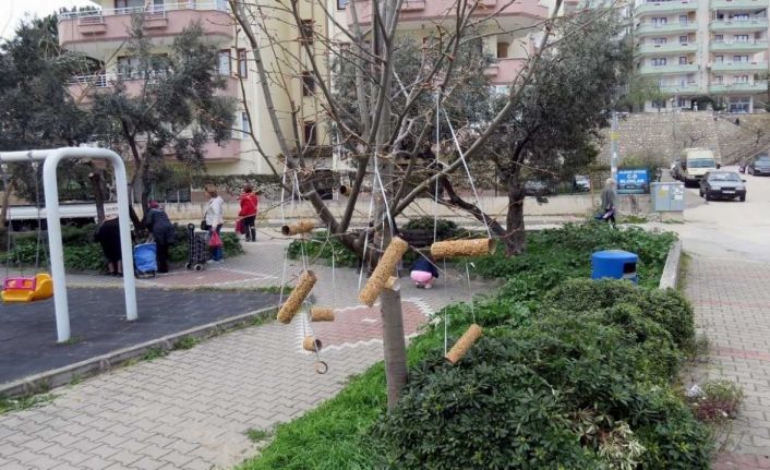Mudanya Halitpaşa Mahallesinde bulunan Samanyolu parkındaki ağaçlarda tünek şeklindeki yem depoları çevrede oturanların ilgisini çekti.