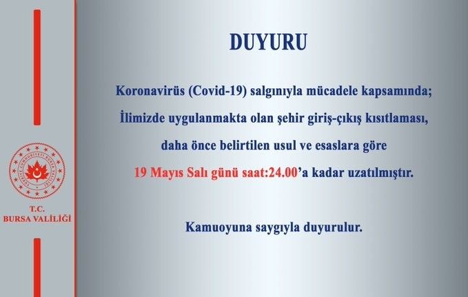 İl Hıfzıssıhha Kurulumuzun 04.05.2020 tarih ve 40 sayılı kararı ile; İlimize kara, hava ve deniz yolu ile (toplu ulaşım aracı, özel araç  vb.) yapılacak tüm giriş çıkışlar,  İçişleri  Bakanlığının 03.04.2020 tarih 6235 sayılı ve 04.04.2020 tarih 6237 sayılı genelgeleri ile 03.04.2020 tarih 23 sayılı ve 04.04.2020 tarih 24 sayılı İl Hıfzıssıhha Kurulu kararlarında belirlenen çerçevede 15 günlük süreyle 4 Mayıs 2020 pazartesi günü saat 24.00’dan  19 Mayıs 2020 Salı günü saat 24.00’a kadar geçici olarak durdurulacaktır. İlimizde yaşayan bulunan tüm vatandaşlarımızın belirtilen süre boyunca ilimizde kalmaları esas olacaktır. İçişleri Bakanlığının 03.04.2020 tarih 6235 sayılı ve 04.04.2020 tarih 6237 sayılı genelgeleri ile 03.04.2020 tarih 23 sayılı,  04.04.2020 tarih 24 sayılı ve 22.04.2020 tarih 34 sayılı İl Hıfzıssıhha Kurulu kararlarında belirlenen usul, esas ve istisnalar bu karar ile getirilen kısıtlama dönemi için de geçerli olacaktır.