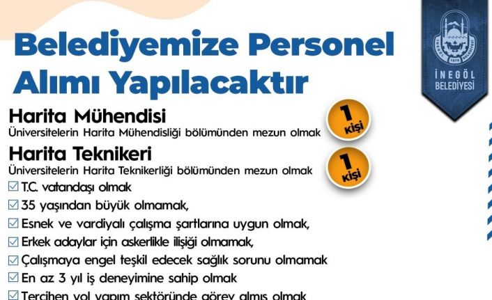 “Kurumumuz bünyesinde istihdam edilmek üzere 2 personel alımı yapılacak. İlçe halkımıza en iyi hizmeti sunmak adına yapılan alım çerçevesinde; 1 harita mühendisi ile 1 harita teknikeri istihdam edilecek. Başvuruda bulunmak isteyen vatandaşlarımızın 31 Mayıs 2023 Çarşamba günü 17.00’a kadar Mesudiye Mahallesi Şipali Yolu No:27 İnegöl Belediyesi Ek Hizmet-2 adresinde bulunan Fen İşleri Müdürlüğü İdari İşler ve Evrak Kayıt Bürosuna bizzat başvurmaları gerekmektedir.”