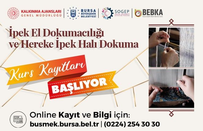 “İpek El Dokumacılığı” ve “Hereke İpek Halı Dokuma” kurslarına katılmak isteyen kişiler, busmek.bursa.bel.tr internet adresindeki online başvuru kısmından ön kayıt yaptırabilecekler.