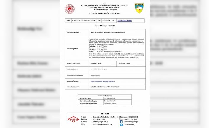 Bursa Valiliği’nin yapılan ve yarın saat 12.00’den Pazar günü 18.00’e kadar sürmesi beklenen uyarıda şu ifadelere yer verildi: "Eskişehir Bölge Tahmin ve Erken Uyarı Merkezince yapılan son değerlendirmelere göre; hava sıcaklıklarının hafta ortasından itibaren 4 ila 9 derece artması beklenmektedir. Yüksek sıcaklıkların meydana getirebileceği (güneş çarpması, vücutta sıvı kaybı gibi) olumsuzluklara karşı özellikle; kronik sağlık problemi olanların, yaşlılarımız ve çocuklarımız başta olmak üzere tüm vatandaşlarımızın günün en sıcak saatleri olan 11.00 ile 16.00 saatleri arasında dikkatli ve tedbirli olmaları, açık alanda bulunmamaları gerekmektedir."