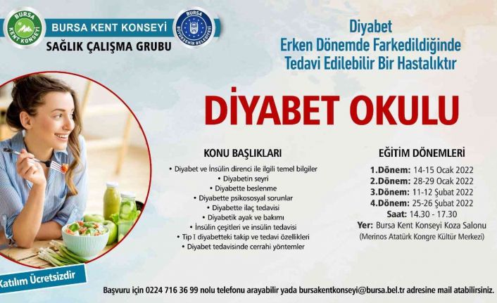 Bursa Kent Konseyi Sağlık Çalışma Grubu tarafından “Diyabet ‘erken dönemde fark edildiğinde’ tedavi edilebilir bir hastalıktır” sloganıyla düzenlenen Diyabet Okulu, 14 Ocak Cuma günü saat 14.30’da Bursa Kent Konseyi Koza Salonu’nda açılıyor. 4 farklı dönemde gerçekleşecek eğitimlerde, konusunda uzman doktorlar tarafından katılımcılara 10 oturumda diyabet ile ilgili bilgiler verilecek.