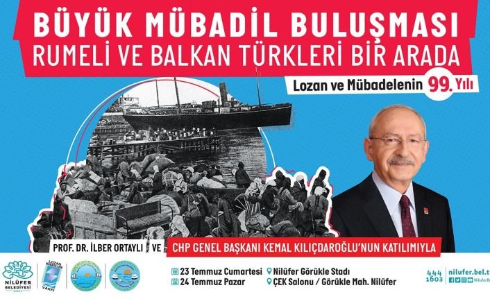 CHP Genel Başkanı Kemal Kılıçdaroğlu, Lozan Barış Antlaşması’nın 99.yılında Nilüfer’de düzenlenecek olan ’Büyük Mübadil Buluşması’nda, Rumeli ve Balkan Türkleri Sivil Toplum Kuruluşlarıyla bir araya gelecek.