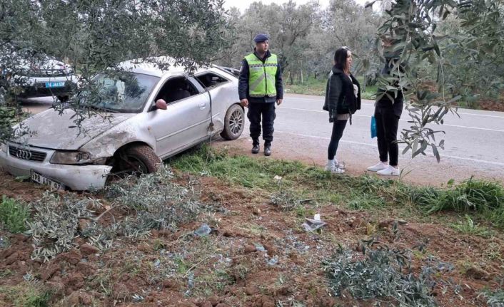 Boyalıca Mahallesi’nde kontrolden otomobil, zeytin bahçesine uçtu. Şoför ve yanındaki kız arkadaşı yara almadan kazayı atlattı.