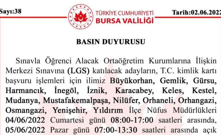 Bursa Valiliği’nden yapılan açıklamada "Sınavla Öğrenci Alacak Ortaöğretim Kurumlarına İlişkin Merkezi Sınavına (LGS) katılacak adayların, T.C. kimlik kartı başvuru işlemleri için ilimiz Büyükorhan, Gemlik, Gürsu, Harmancık, İnegöl, İznik, Karacabey, Keles, Kestel, Mudanya, Mustafakemalpaşa, Nilüfer, Orhaneli, Orhangazi, Osmangazi, Yenişehir, Yıldırım İlçe Nüfus Müdürlükleri 04/06/2022 Cumartesi günü 08:00-17:00 saatleri arasında, 05/06/2022 Pazar günü 07:00-13:30 saatleri arasında açık bulundurulacaktır. Kamuoyuna saygıyla duyurulur." ifadelerine yer verildi.