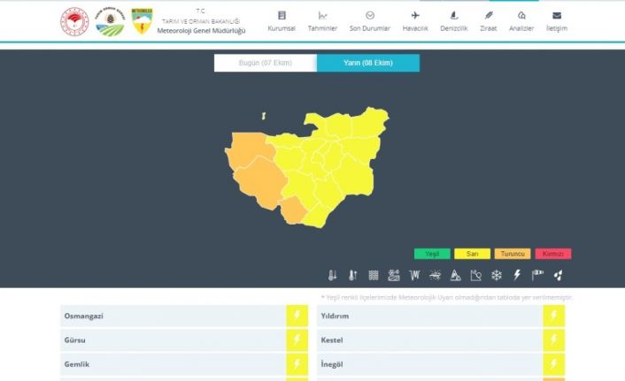 Meteoroloji Genel Müdürlüğü Analiz ve Tahmin Merkezi, Bursa’nın Harmacık, Karacabey ve Büyükorhan ilçeleri için turuncu, diğer ilçeler için sarı uyarıda bulunduğu açıklamada, "08.10.2020 Perşembe saat 09.00’dan itibaren Marmara bölge genelinde görülecek olan sağanak ve gök gürültülü sağanak yağışların, kuvvetli (21-50 Kg/m2) Trakya Kesimi, İstanbul, Çanakkale çevreleri ile Bursa’nın batı ilçelerinde yerel olarak çok kuvvetli (40-75 Kg/m2) olması beklendiğinden ani sel, su baskını, yıldırım, yağış anında kuvvetli rüzgâr, yerel dolu yağışı ve hortum oluşma riski gibi olumsuzluklara karşı dikkatli ve tedbirli olunması gerekmektedir" ifadeleri yer verildi.