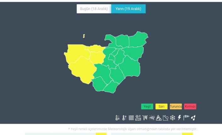 "Mustafakemalpaşa, Nilüfer, Mudanya ve Karacabey ilçelerinde bu gece 04.00’dan başlayıp salı günü saat 23.59’a kadar sürmesi kuvvetli rüzgar beklenmektedir. Kuzey ve kuzeydoğu yönlerden kuvvetli rüzgar ve kısa süreli fırtına (50-70 kilometre/saat) beklendiğinden başta ulaşımda aksamalar olmak üzere meydana gelebilecek olumsuzluklara karşı dikkatli ve tedbirli olunmalıdır."