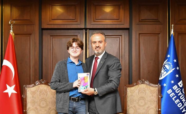 Bursa Büyükşehir Belediyesi tarafından Bursaray istasyonlarına konulan okuma kiosklarından yararlanan 50 bininci okur olan lise öğrencisi, Başkan Aktaş tarafından tabletle ödüllendirildi.