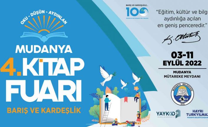 Mudanya 4. Kitap Fuarı; bu yıl “Barış ve Kardeşlik” temasıyla 3 Eylül Cumartesi günü kapılarını açıyor. Mudanya Belediyesi ve YAYKOOP işbirliğinde 3-11 Eylül tarihleri arasında Mütareke Meydanı ve İsmet İnönü Parkı’nda düzenlenecek olan kitap fuarı çerçevesinde 62 yayınevi ile 47 akademisyen, gazeteci-yazar Bursalı kitapseverlerle buluşacak.