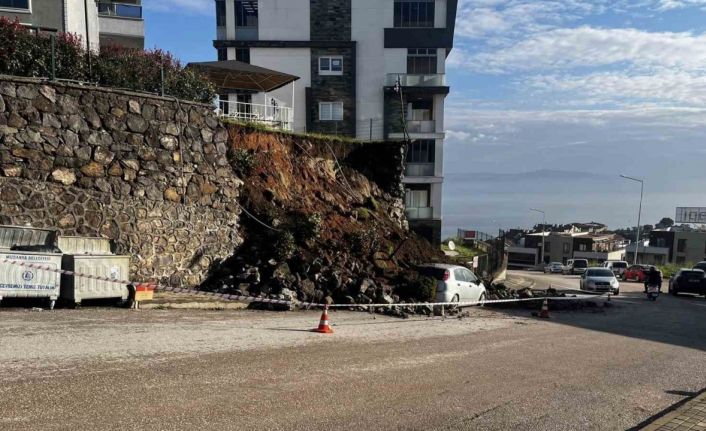 Mudanya’da gece saatlerinde yağışın etkisiyle istinat duvarı çöktü, park halindeki araç kullanılamaz hale geldi.
