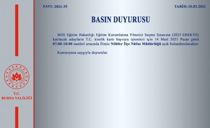 Bursa Valiliği’nden yapılan açıklamada, "Millî Eğitim Bakanlığı Eğitim Kurumlarına Yönetici Seçme Sınavına (2021-EBEKYS) katılacak adayların T.C. kimlik kartı başvuru işlemleri için 14 Mart 2021 Pazar günü 07:00-10:00 saatleri arasında Nilüfer İlçe Nüfus Müdürlüğü açık bulundurulacak. Kamuoyuna saygıyla duyurulur." ifadelerine yer verildi.Nilüfer İlçe Nüfus Müdürlüğü pazar günü açık