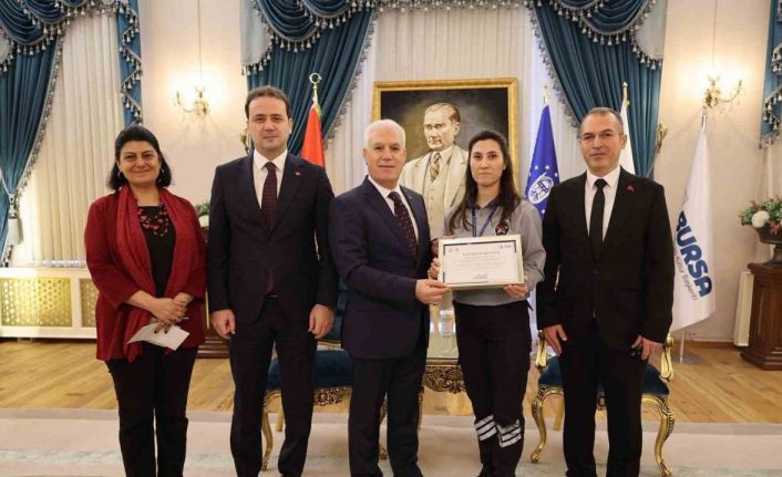 Bursa Büyükşehir Belediye Başkanı Mustafa Bozbey, Büyükşehir Belediyesi’nin Ana Hizmet Binası’na gelen vatandaşları güler yüzle karşılayan ve yardımcı olan güvenlik görevlisi Fatma Yılmaz’a özverili çalışmalarından dolayı teşekkür belgesi verdi.