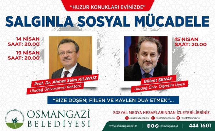 Osmangazi Belediyesi, Çin’de başlayıp, dünyayı etkisi altına alan ve Türkiye’de de ölümlere yol açan koronavirüse karşı her türlü tedbiri alırken, vatandaşlar için farklı uygulamalara imza atıyor. ‘Huzur Konukları Evinizde’ adlı etkinlik ile Uludağ Üniversitesi Rektörü Prof. Dr. Ahmet Saim Kılavuz ile birlikte birbirinden değerli akademisyenler ve edebiyatçılar her akşam saat 20.00’de Osmangazi Belediyesi’nin sosyal medya hesapları üzerinden Osmangazililerin evlerine konuk olacak.