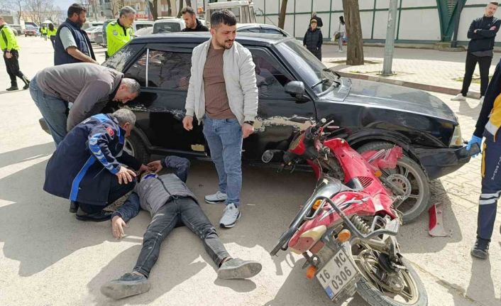 Bursa’nın İnegöl ilçesinde otomobil ile çarpışan motosikletin sürücüsü yaralandı. Yaralıya ilk müdahaleyi alışverişe gelen sağlık görevlisi yaptı.