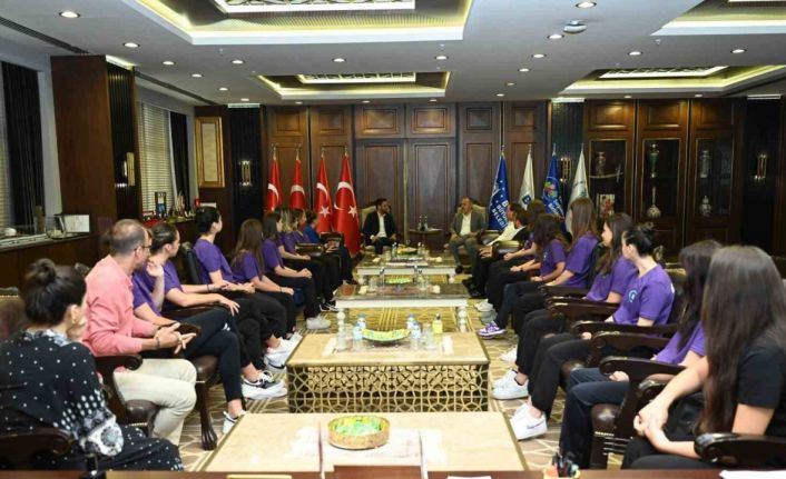 Yaklaşık 10 yıl önce Mudanya’da ilkokul 4. sınıftayken Antrenör Merve Yılmaz tarafından okullardan seçilerek hentbolla tanışan ve kısa zamanda ayakta alkışlanacak bir başarı hikâyesine imza atan Poyrazın Kızları, son 2 yıldır Bursa Büyükşehir Belediyespor Kulübü’nün formasını terletiyor. Büyükşehir çatısı altındaki henüz ikinci yıllarında Türkiye Şampiyonluğunu Mudanya’ya kazandıran sporcular, ayrıca okul sporlarında 4 Türkiye Şampiyonluğu elde ederek yakalanması güç bir başarıya da imza attılar. 26 Ağustos’ta başlayacak Süper Lig’e, biri Sırp, biri Karadağlı iki yabancı oyuncu transferiyle iddialı bir şekilde hazırlanan Poyrazın Kızları, sezon öncesi Büyükşehir Belediye Başkanı Alinur Aktaş’ı ziyaret etti. Ziyarette Antrenör Merve Yılmaz ile Büyükşehir Belediyespor Kulübü Başkanı Gökhan Dinçer’in de katıldığı ziyarette sporcularla sohbet eden Başkan Aktaş, yeni sezon için başarı dileğinde bulundu.