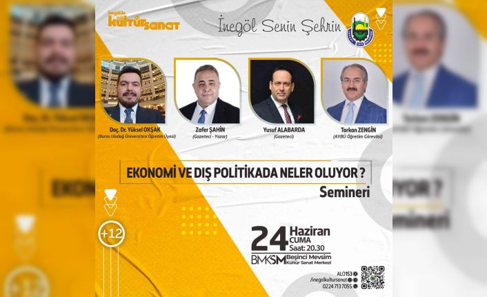 Önemli ve özel konu ile konukların yer alacağı program, cuma akşamı 20.30’da Beşinci Mevsim Kültür Merkezinde gerçekleştirilecek. Bursa Uludağ Üniversitesi Öğretim Üyesi Doç. Dr. Yüksel Okşak’ın moderatörlüğünde; Gazeteci-Yazar Zafer Şahin, Gazeteci Yusuf Alabarda ve Ankara Yıldırım Beyazıt Üniversitesi Öğretim Görevlisi Tarkan Zengin’in konuşmacı olarak katılacağı program öncesi İnegöl Belediye Başkanı Alper Taban tüm ilçe halkına çağrıda bulundu. Güncel konular ile ekonomik gelişmelerin tartışılacağı “Ekonomi ve Dış Politikada Neler Oluyor” konulu seminerde özellikle küresel gelişmeler üzerinde durulacak.