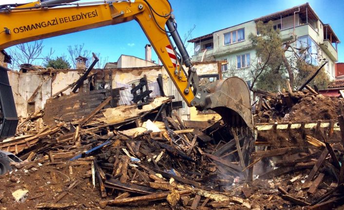 Osmangazi Belediyesi, Yahşibey Mahallesi’nde dün akşam saatlerinde çıkan yangında büyük bölümü yanarak çöken iki katlı ahşap binanın, ayakta kalan ve vatandaşlar için tehlike oluşturan bölümlerini gece saatlerinde yürüttüğü çalışma ile yıktı.