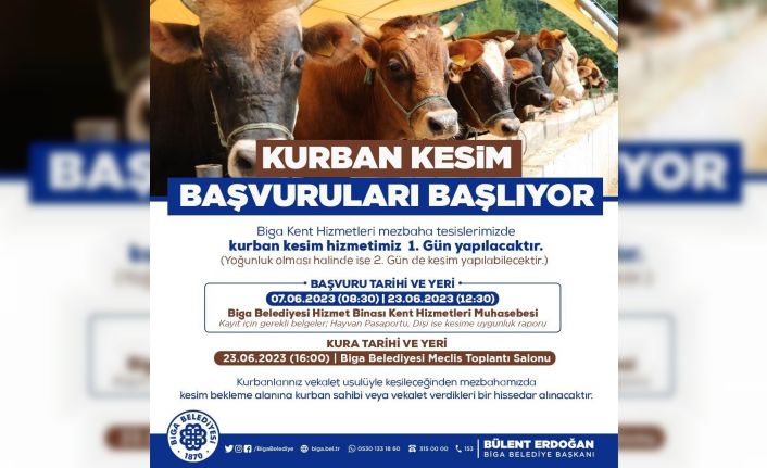 Çanakkale’nin Biga ilçesinde, Kurban Bayramı’nda vekalet usulüyle Biga Belediyesi’nin Mezbaha Tesisleri ile Biga Ticaret Borsası Canlı Hayvan Pazarı’nda kurban kesimi yaptıracak olan vatandaşlar için başvuru tarihi belli oldu.