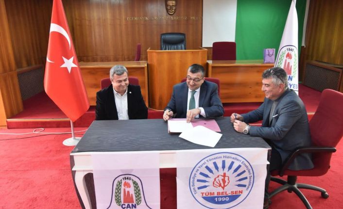 Çalışanlarının emeğini ve hakkını sosyal belediyecilik anlayışı gereği önemseyen Çan Belediye Başkanı Bülent Öz, emekten ve emekçiden tasarruf olmaz diyerek Tüm Bel-Sen ile sözleşme imzaladı. Başkan Öz, “Çan Belediyesi olarak çalışanlarımıza sahip çıkıyor, herkesin eşit oranda faydalanacağı sözleşme ile en yüksek tavan oranı olan yüzde 120 oranında bir artışa imza atıyoruz. Çalışan memur emekçilerimizi memnun edecek sözleşme ile haklarını koruyoruz. Tüm Bel-Sen ile imzaladığımız sözleşmemiz Çan Belediyesi çalışanlarımıza hayırlı olmasını diliyorum” dedi.