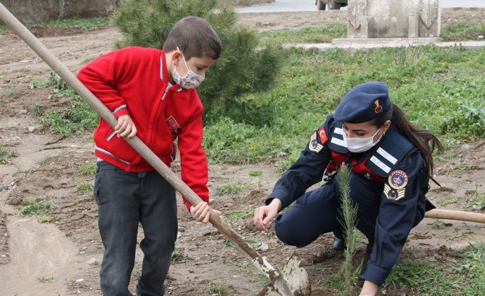 Çanakkale İl Jandarma Komutanlığı ekipleri, ilkokul öğrencileriyle birlikte fidan dikti.
