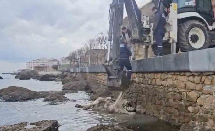 Çanakkale’nin Gelibolu ilçesinde sahile vuran ölü inek ekipler tarafından denizden çıkarıldı.