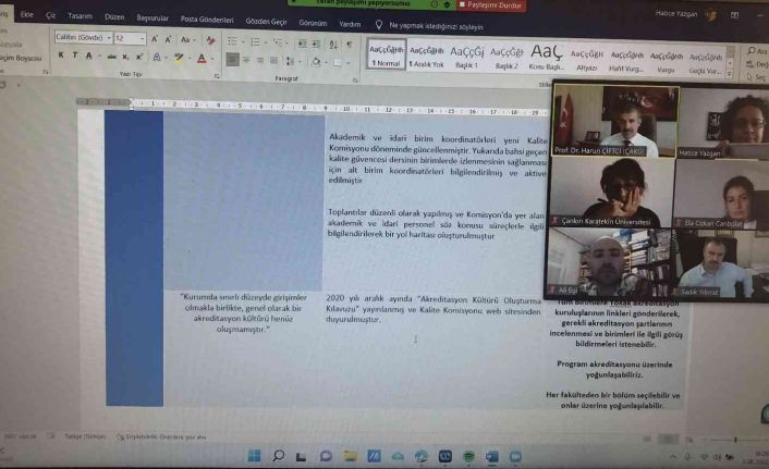 Çankırı Karatekin Üniversitesi (ÇAKÜ) Kalite Komisyonu’nun Eylül ayı içinde gerçekleşmesi planlanan Yüksek Öğretim Kalite Kurulu (YÖKAK) 2022 yılı İzleme Programı için çevrimiçi hazırlık toplantısı gerçekleştirildi. Toplantıya Rektör Prof. Dr. Harun Çiftçi, Rektör Yardımcısı Prof. Dr. Hüseyin Odabaş, Bologna Eşgüdüm Komisyonu Başkanı Prof. Dr. Baran Önal Ulusoy, Strateji Geliştirme Daire Başkanı Doç. Dr. Ela Özkan Canbolat, Kalite Komisyonu Başkanı Doç. Dr. Hatice Yazgan, Web Koordinatörlüğü’nü temsilen Araştırma Görevlisi Ali Egi ve Genel Sekreter Sadık Yılmaz katıldı.