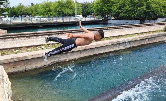 Adana’da nem ile birlikte hissedilen sıcaklığın 40 dereceyi geçtiği şu günlerde gençler sulama kanalına girerek serinliyor.