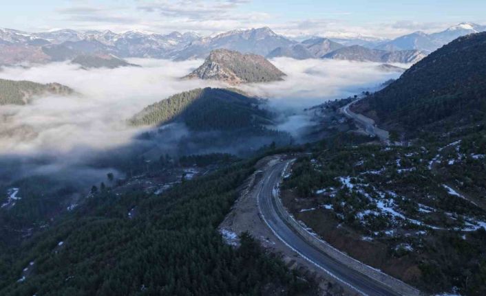 Adana’nın Feke ilçesinde, kızılçam ormanları ve karlı dağların arasında sabah saatlerinde oluşan sis, muhteşem bir manzara sundu.