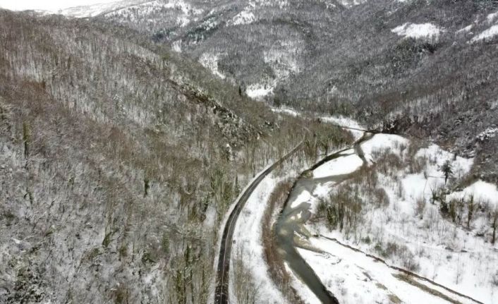 Batı Karadeniz bölgesinde etkili olan kar yağışının ardından Bartın Karabük karayolunda ağaçların ve dallarının yol üzerine eğimi ile oluşan ağaç tünelde eşsiz manzaralar drone ile havadan görüntülendi.