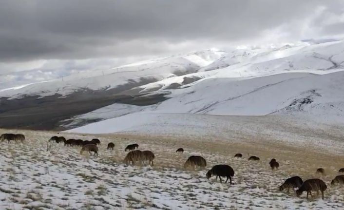Ağrı’nın yüksek kesimlerinde etkili olan kar yağışına hazırlıksız yakalanan çoban, koyunlarını kar altında otlattı.