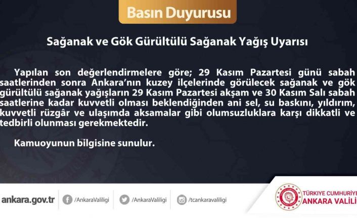 Ankara Valiliği, şehrin kuzey ilçelerinde yarın başlanması beklenen gök gürültülü sağanağın 30 Kasım sabahına kadar devam edeceğini belirtti. Vatandaşların olası olumsuz durumlara karşı tedbir almaları yönünde uyarıda bulunan Valilik, konuyla ilgili yaptığı açıklamada, “Yapılan son değerlendirmelere göre; 29 Kasım Pazartesi günü sabah saatlerinden sonra Ankara’nın kuzey ilçelerinde görülecek sağanak ve gök gürültülü sağanak yağışların 29 Kasım Pazartesi akşam ve 30 Kasım Salı sabah saatlerine kadar kuvvetli olması beklendiğinden ani sel, su baskını, yıldırım, kuvvetli rüzgar ve ulaşımda aksamalar gibi olumsuzluklara karşı dikkatli ve tedbirli olunması gerekmektedir. Kamuoyunun bilgisine sunulur” ifadelerine yer verdi.