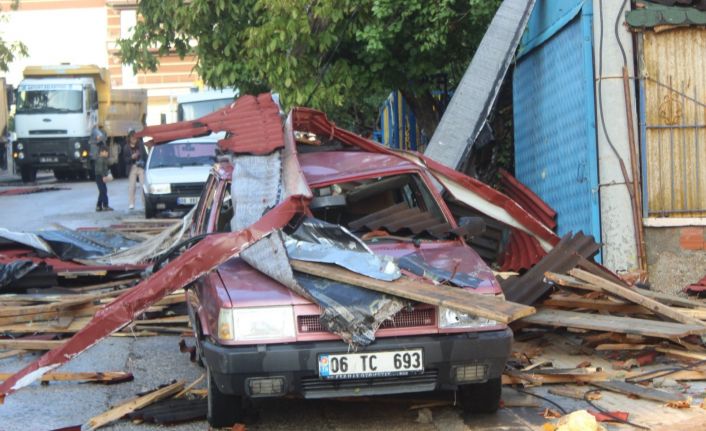 Ankara’nın Akyurt ilçesinde şiddetli yağış ve fırtınada 3 binanın çatısı uçarken, çatı parçalarının üzerine düştüğü 3 araç da ağır hasar gördü.