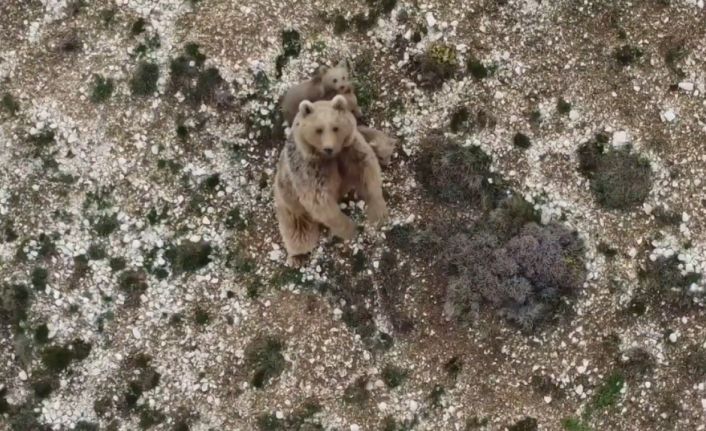 Erzincan’ın Çayırlı ilçesinde köyün yakınlarına kadar gelen anne boz ayı ve 3 küçük yavrusu, koyun sürüsünü otlatan Mert Yılmaz tarafından dron ile havadan görüntülendi.