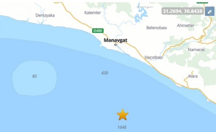 Antalya’nın Manavgat ilçesi açıklarında 4,1 büyüklüğünde deprem meydana geldi.