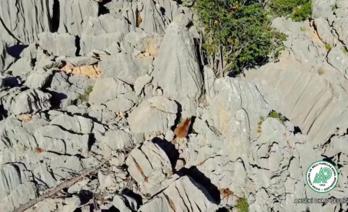 Antalya DKMP tarafından yaban hayatını koruma sahasında kayalıklarda dolaşan anne ayı ve ikiz yavruları dron ile görüntülendi.