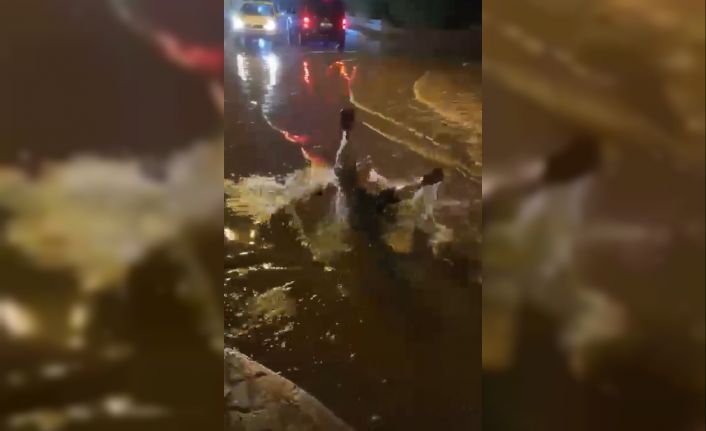 Yaz aylarında aşırı sıcaktan kavrulan Antalya’da akşam saatlerinde aniden bastıran sağanak yağmur vatandaşları, özellikle çocukları sevince boğdu. Kısa süren ancak etkili olan sağanakta yolların su ile dolduğunu gören Antalyalılar, su birikintisine girip doyasıya eğlendi.