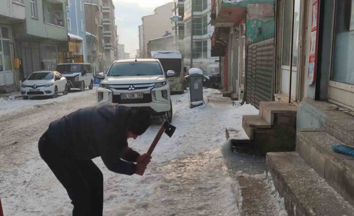 Gece saatlerinde hava sıcaklığının sıfırın altına düşmesiyle birlikte cadde ve sokaklar adeta buz pistine dönerken, özellikle iş yeri önlerinde oluşan kalın buz tabakası esnafa zor anlar yaşattı.