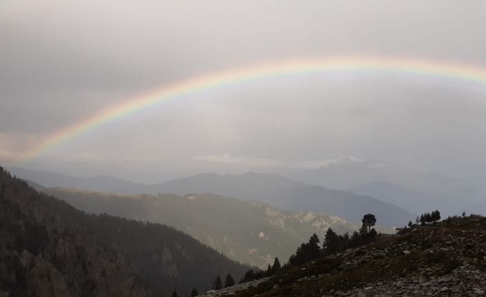 Artvin’in Yusufeli ilçesine bağlı Tekkale köyü Selant yaylasında sağanak yağmurun ardından oluşan gök kuşağı görüntüsü muhteşem manzara sundu. İki dağı birleştiren gök kuşağı görenleri kendine hayran bıraktı. Bölge halkından Durmuş Yazıcı, gök kuşağının eşsiz manzarasını kayıt altına aldı. Gök kuşağının renk cümbüşü ve bulutlarla bütünleşen haliyle kartpostallık görüntüleri aratmadı.