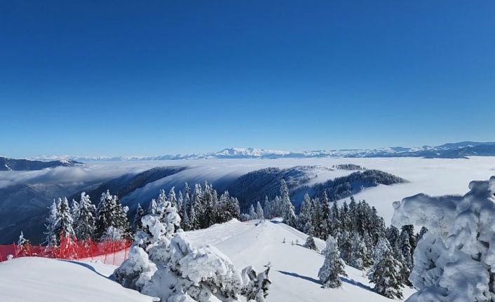 Kayak yapmak için bölgeye gelen ziyaretçiler, karla kaplı ormanların üzerindeki bu etkileyici manzaraya tanıklık etti. Sis denizinin oluşturduğu büyüleyici atmosfer, ziyaretçilere unutulmaz anlar yaşattı.