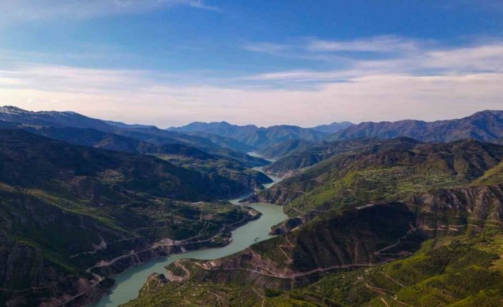 Artvin’in yüksek kesimlerinde kar etkisini sürdürürken, vadilerde ilkbaharın gelişiyle birlikte doğa adeta yeniden canlandı. Karlı dağlar ve yeşeren ormanlar havadan görüntülendi.