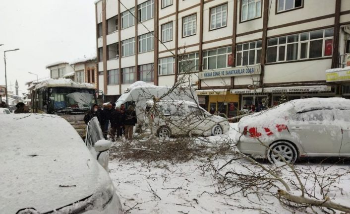 Tokat’ın Niksar ilçesinde asırlık çam ağacının dalları kar yağışına dayanamayarak iki aracın üzerine düştü.