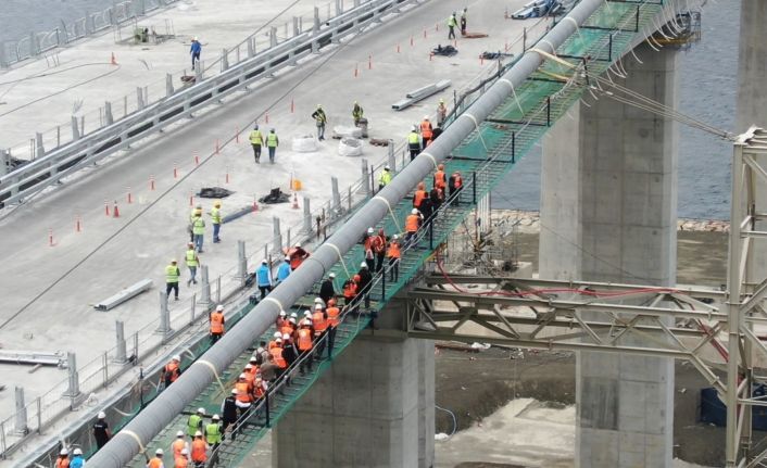 1915 Çanakkale Köprüsü’nde tarihî anlar yaşandı. Ulaştırma ve Altyapı Bakanı Adil Karaismailoğlu ve yanındaki protokol mensupları, 4 bin 608 metre uzunluğundaki, işçilerin üzerinde yürüdüğü ‘kedi yolu’na çıkarak, Asya’dan Avrupa yakasına geçti. 1915 Çanakkale Köprüsünün büyük ölçüde tamamlandığını ifade eden Bakan Karaismailoğlu, “Sadece kulelere yakın kısımlardaki tabliyelerin montajı kaldı. Artık asırların hayâli için geri sayım başladı. Köprü, 101 kilometre uzunluğu ile Kınalı-Tekirdağ-Çanakkale-Savaştepe Otoyolu Projesi kapsamında yer alıyor. 2 bin 23 metre orta açıklık ve 770’er metre yan açıklıklar ile beraber 3 bin 563 metre uzunluğundadır. 2 bin 23 metrelik orta açıklık, Cumhuriyetimizin 100. kuruluş yıl dönümünü temsil ediyor ve tamamlandığında dünyanın en büyük orta açıklıklı asma köprüsü unvanına sahip olacak. 365 ve 680 metrelik yaklaşım viyadükleri ile beraber toplam geçiş uzunluğu ise 4 bin 608 metreye ulaşıyor. Köprümüzün 318 metrelik çelik kuleleri, Çanakkale Deniz Zaferinin kazanıldığı 18 Mart 1915’i işaret edecektir. İki çelik kule arasındaki köprümüz, dünyada ikiz tabliye olarak tasarlanan nadir asma köprülerden biri olma özelliğine de sahip. Tamamlanınca, dünyada 2 bin metre orta açıklığın üzerinde ikiz tabliye olarak tasarlanan ve inşa edilen ilk köprü olarak tarihe geçecek. 318 metrelik kule yüksekliği ve 16 metrelik mimarî amaçlı top mermisi figürüyle birlikte düşünüldüğünde deniz seviyesinden 334 metre yüksekliğe erişecek ve dünyanın en yüksek kulelerine sahip asma köprüsü olacak. Kısaca 1915 Çanakkale Köprüsü Çanakkale Boğazına adeta mühür vuracak ve ülkemizin simge yapılarından bir olacak” dedi.