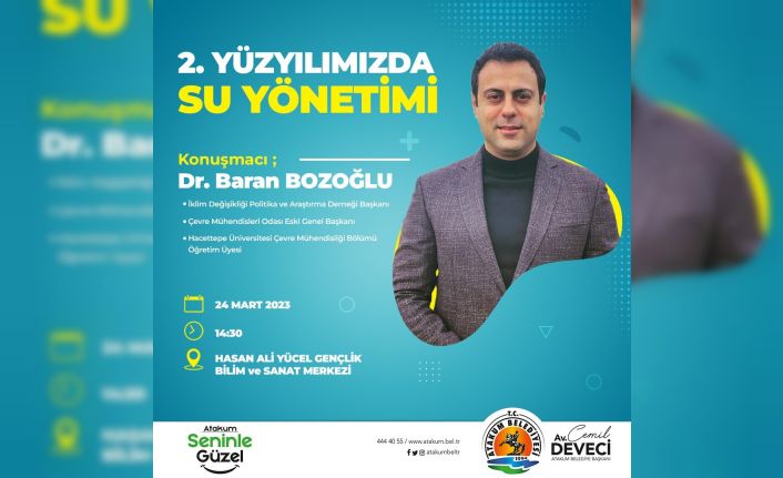 Atakum Belediyesi İklim Değişikliği ve Sıfır Atık Müdürlüğü tarafından “22 Mart Dünya Su Günü” etkinlikleri kapsamında “2.Yüzyılımızda Su Yönetimi” başlıklı panel düzenleniyor. Panelde Hacettepe Üniversitesi Çevre Mühendisliği Bölümü Öğretim Görevlisi, İklim Değişikliği Politika ve Araştırma Derneği Başkanı ve eski TMMOB Çevre Mühendisleri Odası Başkanı Dr. Baran Bozoğlu kullanılabilir suyun mevcut durumu, su yönetimi ve ülkemizde uygulanan su politikaları hakkında katılımcılara önemli bilgiler verecek. Hasan Ali Yücel Gençlik, Bilim ve Sanat Merkezi Konferans Salonu’nda 24 Mart Cuma günü gerçekleştirilecek panel saat 14.30’da başlayacak.