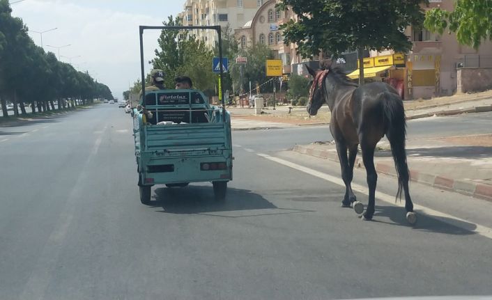 Merkez Onikişubat ilçesi Necmettin Erbakan Bulvarı’nda meydana gelen olayda, üzerinde 2 kişi bulunan plakası öğrenilemeyen sepetli elektrikli motosiklete bağlanan atı gören çevredeki vatandaşlar cep telefonu kamerasıyla o anları görüntüledi. Bağladıkları atı çekerek yolculuk yapan kişiler bir süre sonra trafikte gözden kayboldu.